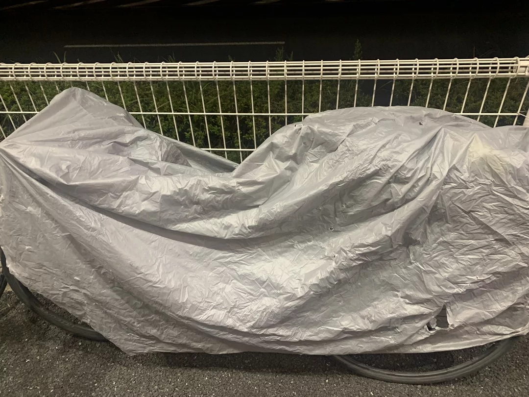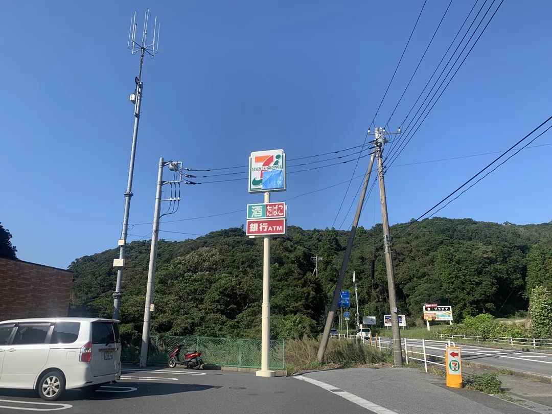 勝浦を抜けて鴨川へ向かう途中のコンビニでトイレ休憩。看板がブルーシートで覆われています。台風の影響でしょうか。