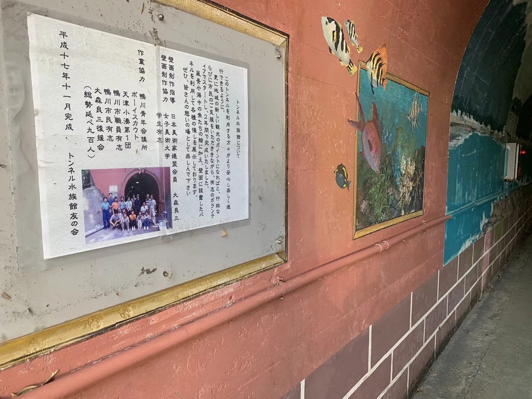 トンネルを通過直前に、歩道にある『とんねるすいぞくかん』に目が止まりました。なんだろ? これ?