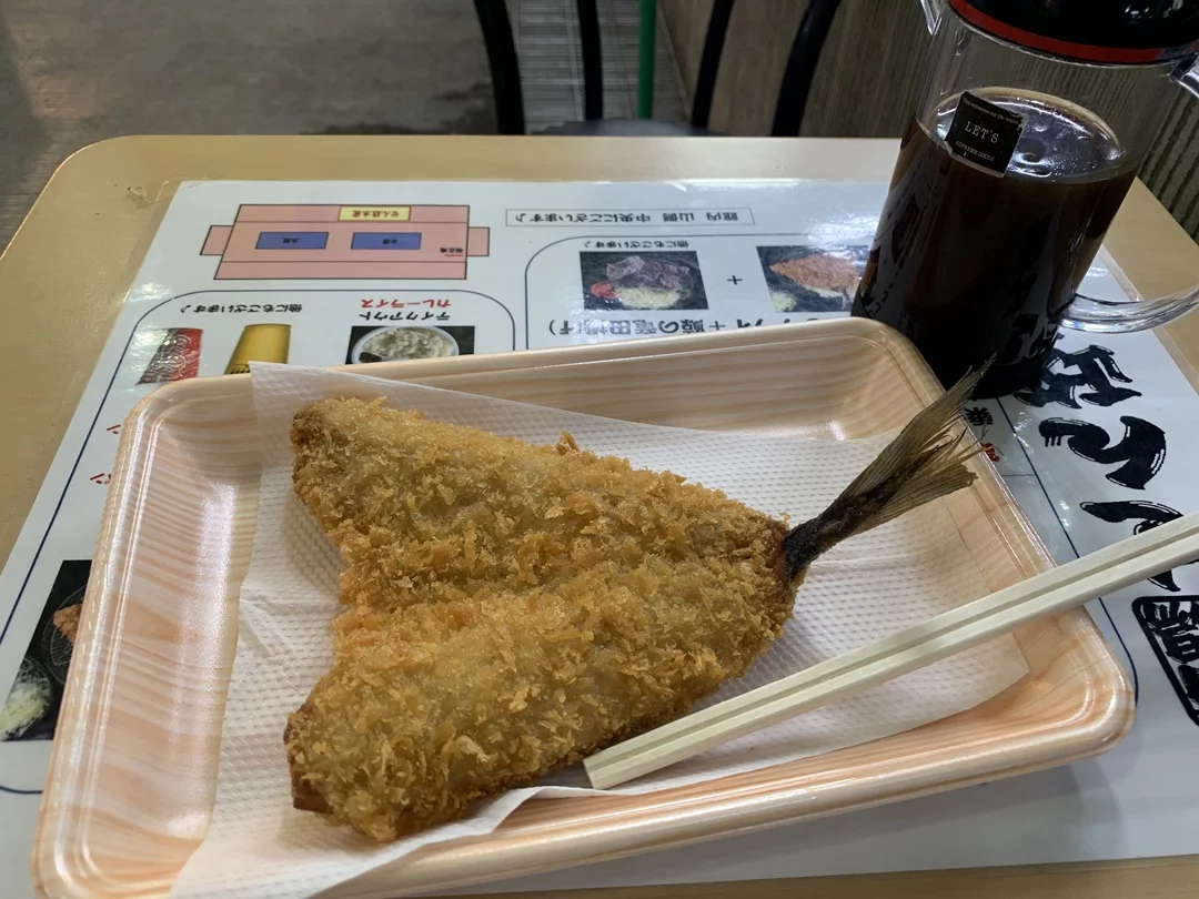 てっぱつ(方言で大きいの意)アジフライをいただきました。注文してから揚げてくれるのでサクサクです。
