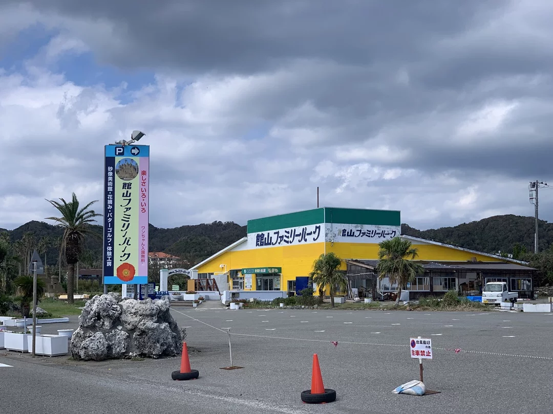 館山ファミリーパークも台風被害で閉鎖中。ここもろんぐらいだぁす!×B.B.BASEのコラボイベントで立ち寄って記念撮影をした場所です。