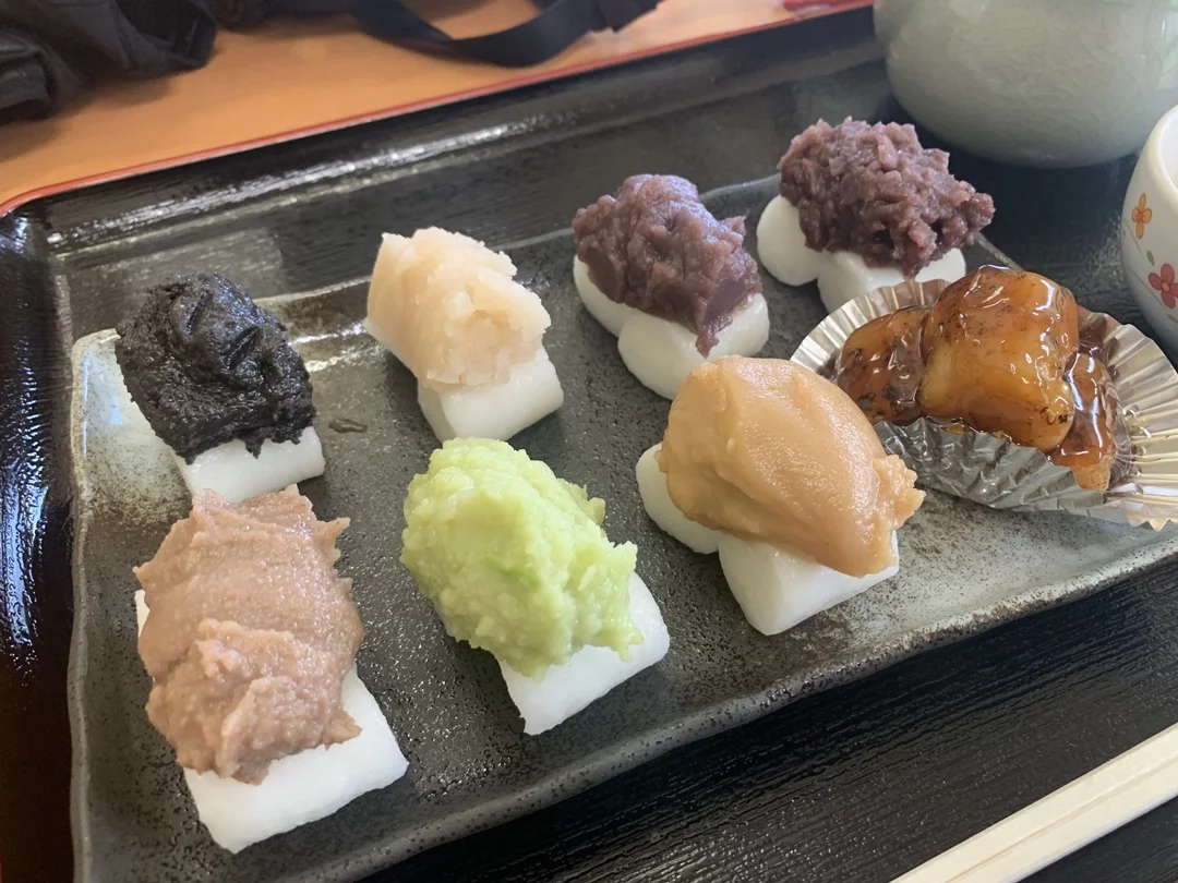 小さなお団子に8種類のタレや餡子が乗っています。お茶はセルフでお代わり自由。