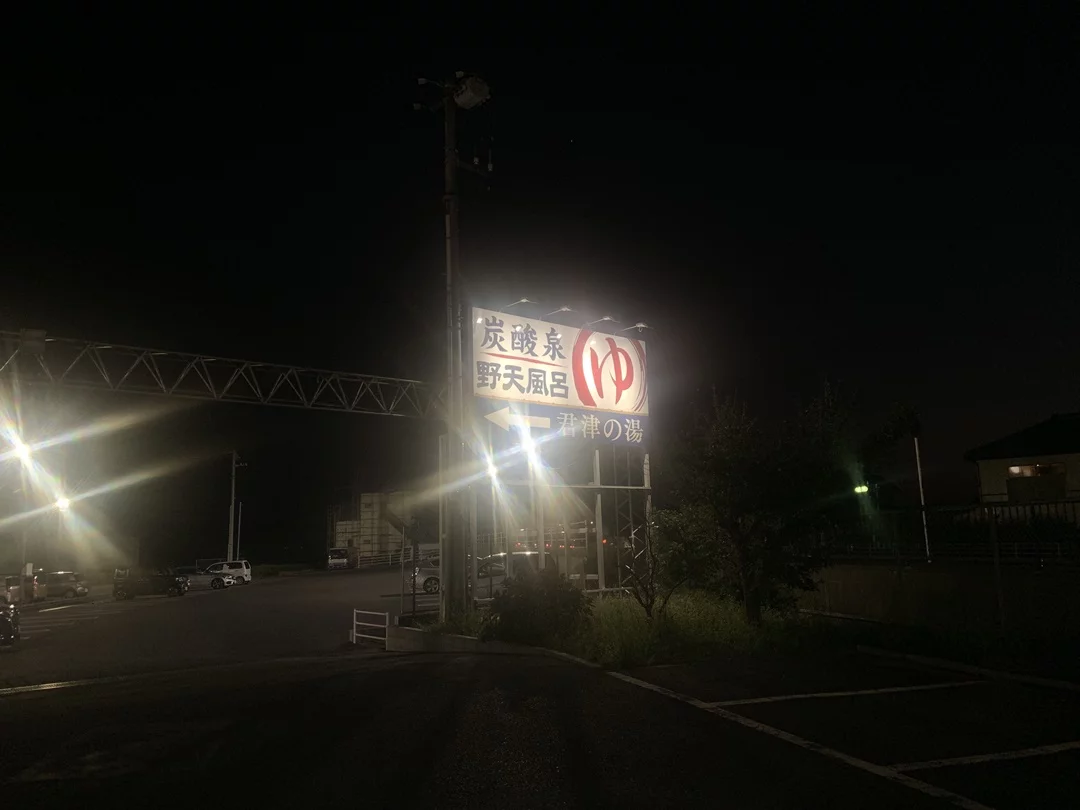 今日の宿にする快活CLUB木更津店はシャワーがありません。なので10km手前の君津の湯へ。到着した頃には辺りはもう真っ暗です。