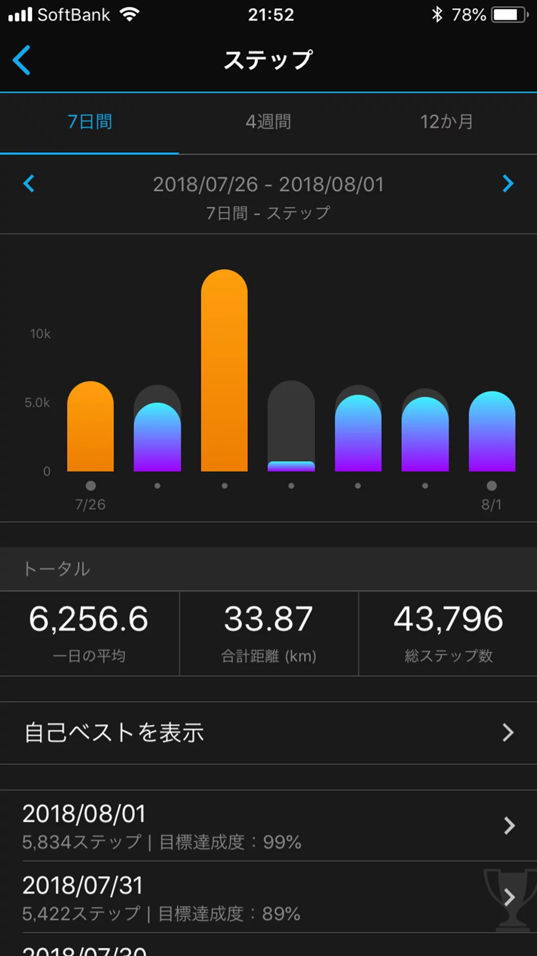 次の図は「Garmin Connect」というGarminが提供する無料Webサービスにデータを同期させた過去1週間の歩数記録です。スマホアプリでもWebサイトでも同じデータが閲覧できるようになっています。