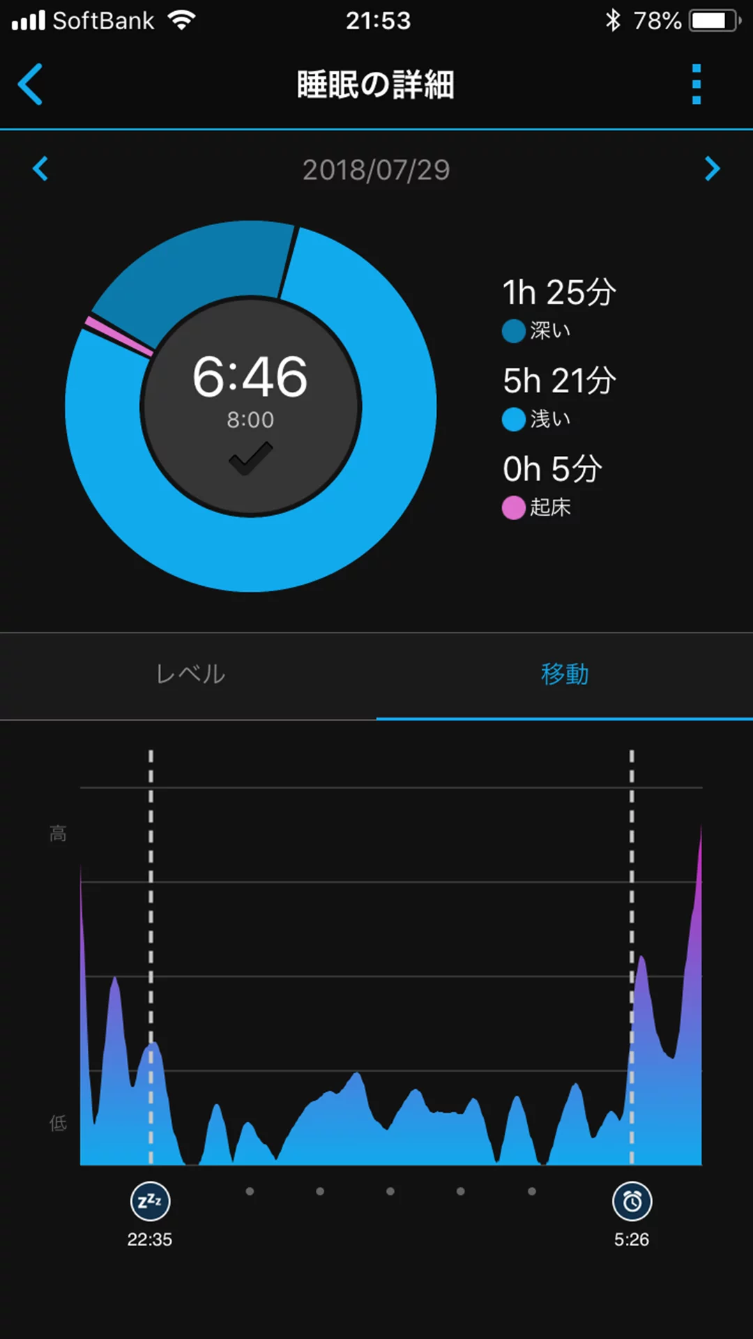 ForeAthlete230Jは睡眠中の動きを測定する機能も備わっています。44gと軽くて着けていても気にならないので、僕は一日中着けっぱなしだったりします。下の図のようにレム睡眠、ノンレム睡眠の割合が一目で分かるので、睡眠の質を把握し、健康管理に役立てることができるのも魅力の一つです。