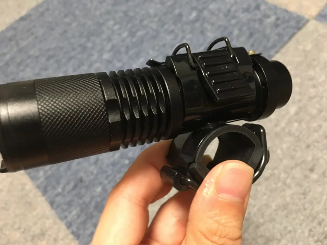 ブルベライダーご用達のジェントス閃が有名ですが、ネットで手頃な価格で買えるものに、Cree社製LEDを搭載したハンドライトがあります。僕も1つ持っているのですが、付属するライトホルダーが合わず、代わりにマジックテープ式のライトホルダーを使っていました。こんなやつ。