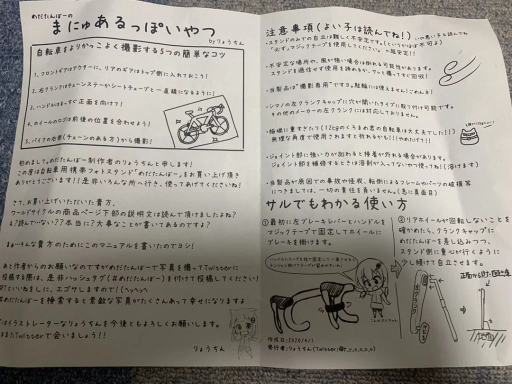 めだたんぼーは、りょうちんさんが個人で開発した写真撮影向けの自立スタンドです。このめだたんぼーを使い、スタンドが使われているとは思えないロードバイクの自立する写真をTwitterに投稿したところ大反響を呼び、バイシクルクラブやスポーツ新聞でも紹介されました。