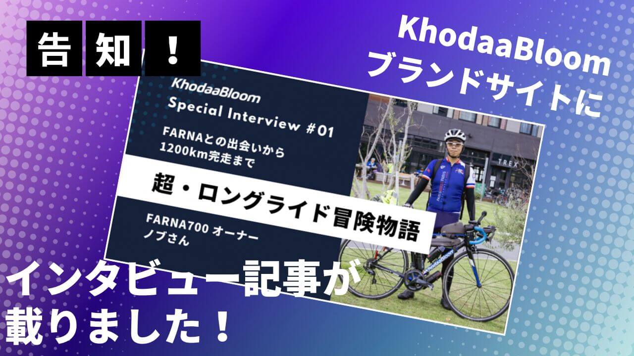 インタビュー内では、KhodaaBloom FARNA700のオーナーである私が、ロードバイクを始めるきっかけやFARNAとの出会い、日本一周、ブルべ、PBP2023のことなど、ロードバイクの楽しみ方について、いろいろと語っています。