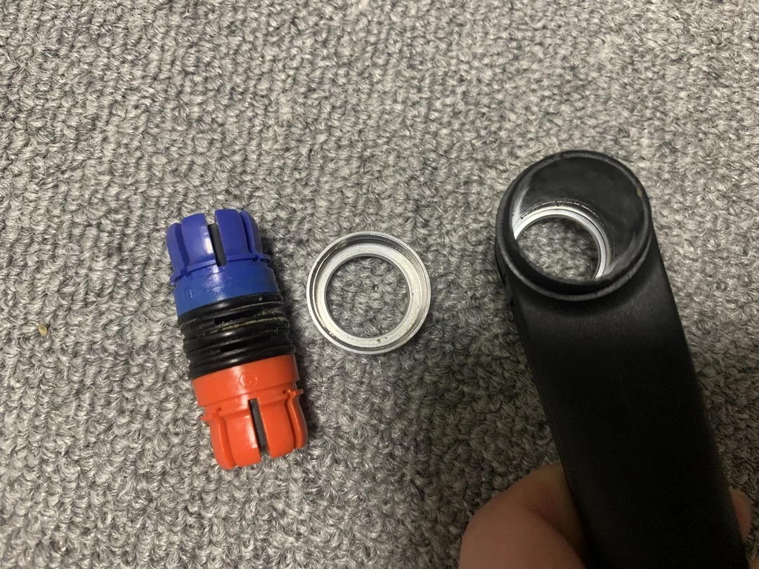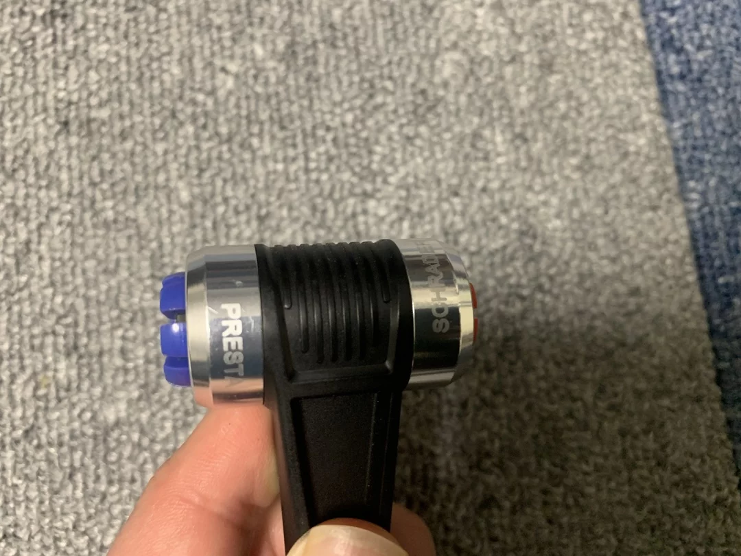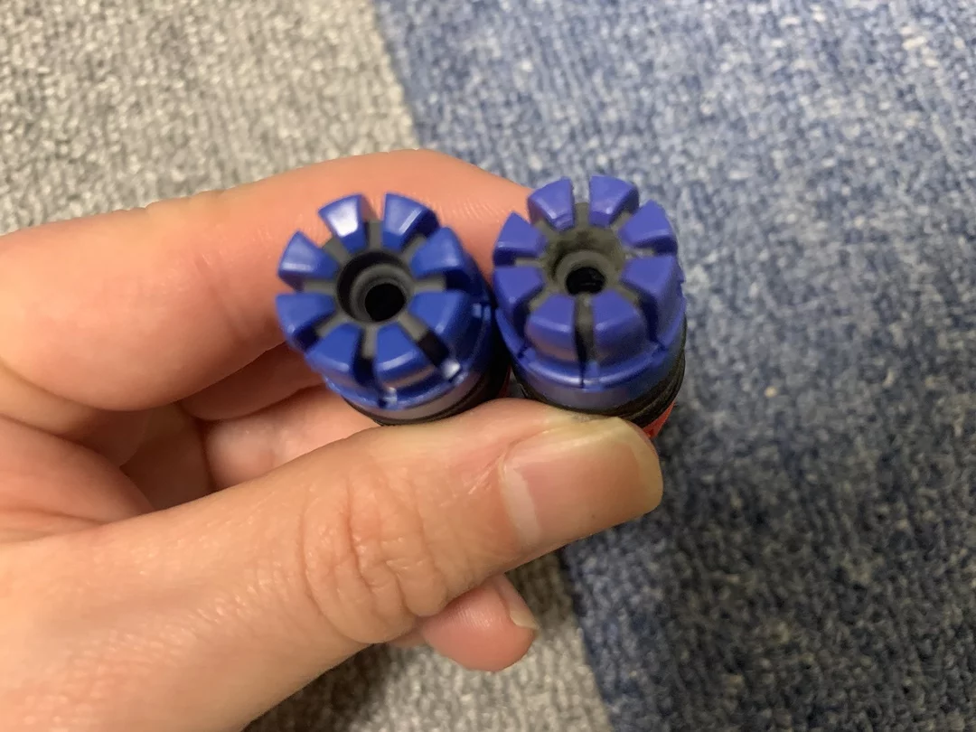 では、新しい口金コアに交換していきます。仏式側(青い方)のキャップを外していたので、米式側(赤い方)から押し込んでいきます。