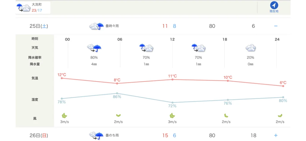開催日となる3月25日(土)の天気予報は雨。この雨は避けられそうにないため、雨具の用意は必須です。それに気温もあまり上がらないため、防寒着も必要となりそうでした。