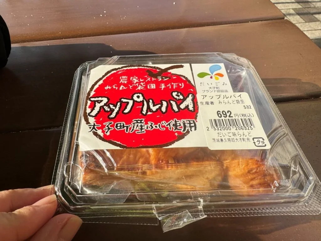 そこで、別の奥久慈名物にターゲットを変更。奥久慈林檎のアップルパイを購入し、外のデッキスペースで食べることにしました。