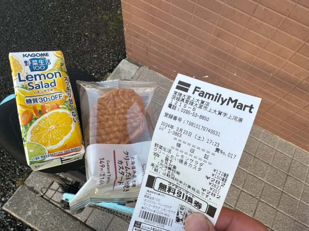 引き続きの雨の中、ファミリーマート 宇都宮下平出町店に到着したのが12時15分頃。道中2回の寄り道は変わらないのに、去年より35分遅れでの到着です。タイヤの転がり抵抗が高く、本当に進まない。