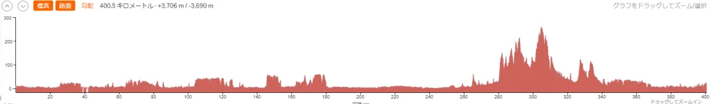 RWGPSの標高マップを見るとほぼ平坦。房総半島を走る後半の280~340kmで山間部を通るようなコースプロフィールとなっていました。