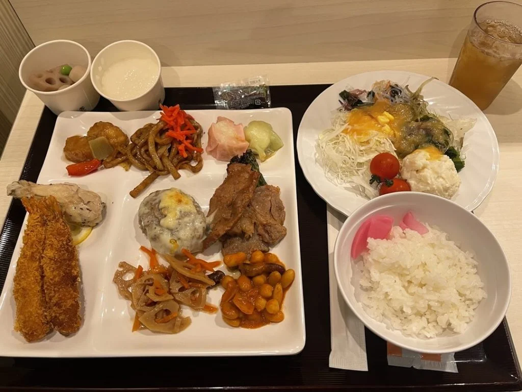 朝食もバイキング形式。焼魚や目玉焼きなどTHE朝食といったラインナップに加え、カレーやうどん、それにヨーグルトやフルーツポンチなどのデザートもありました。