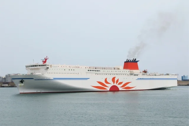 『さんふらわあ』は、三井商船フェリーが登録商標を持つ貨客船で、朝日が昇るような太陽のデザインが施されているのが特徴です。
