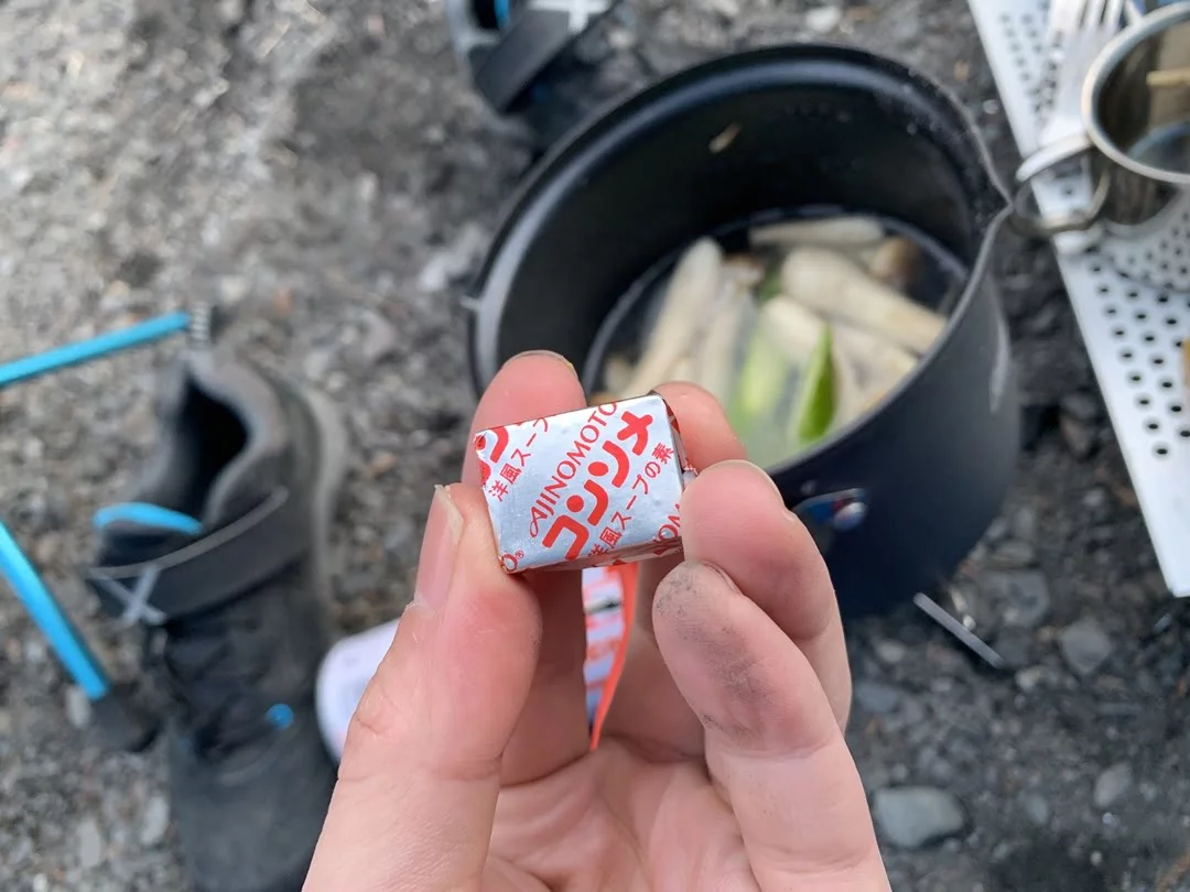 昨日はゆるキャン△に登場した『コッヘル一つでできるスープパスタ』を作りましたが、具材は多めに持ってきていて余りがあるので、汁物を作ります。まずはオリーブオイルで具材を炒めていきます。