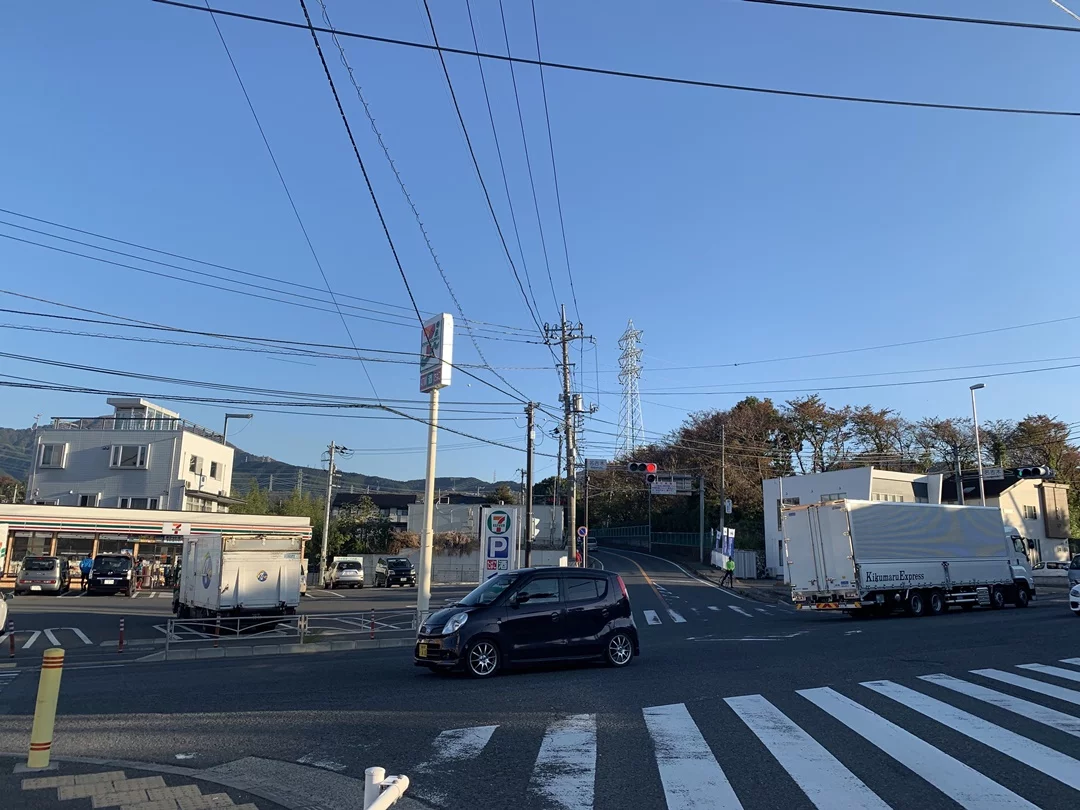 秦野駅から7~8分で名古木交差点に到着しました。まずは交差点にあるセブンイレブンで補給します。
