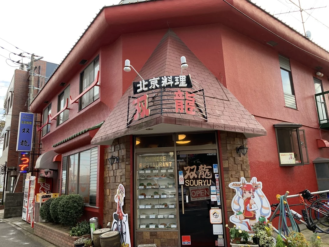 座間市で246号線を左折し県道42号線に入り、小田急線の線路を越えた先に「双龍」があります。見た目は普通の中華料理店……、でもないですね。ポップがサブカル全開です。