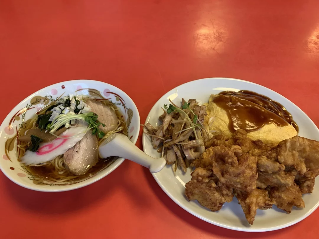今回注文したのは「ろんぐらいだぁす!セット」1,500円。右の大皿が、大量の唐揚げにチャーシューの和え物、それとふわふわ卵の餡かけ。右はミニラーメンです。大ボリュームで動きたくないと思うほどお腹がパンパンになりました。ちなみにプラス300円でご飯とサラダもセットで追加できるとのこと。味付けは濃いめでしたが疲れた体にはちょうどよかったです。